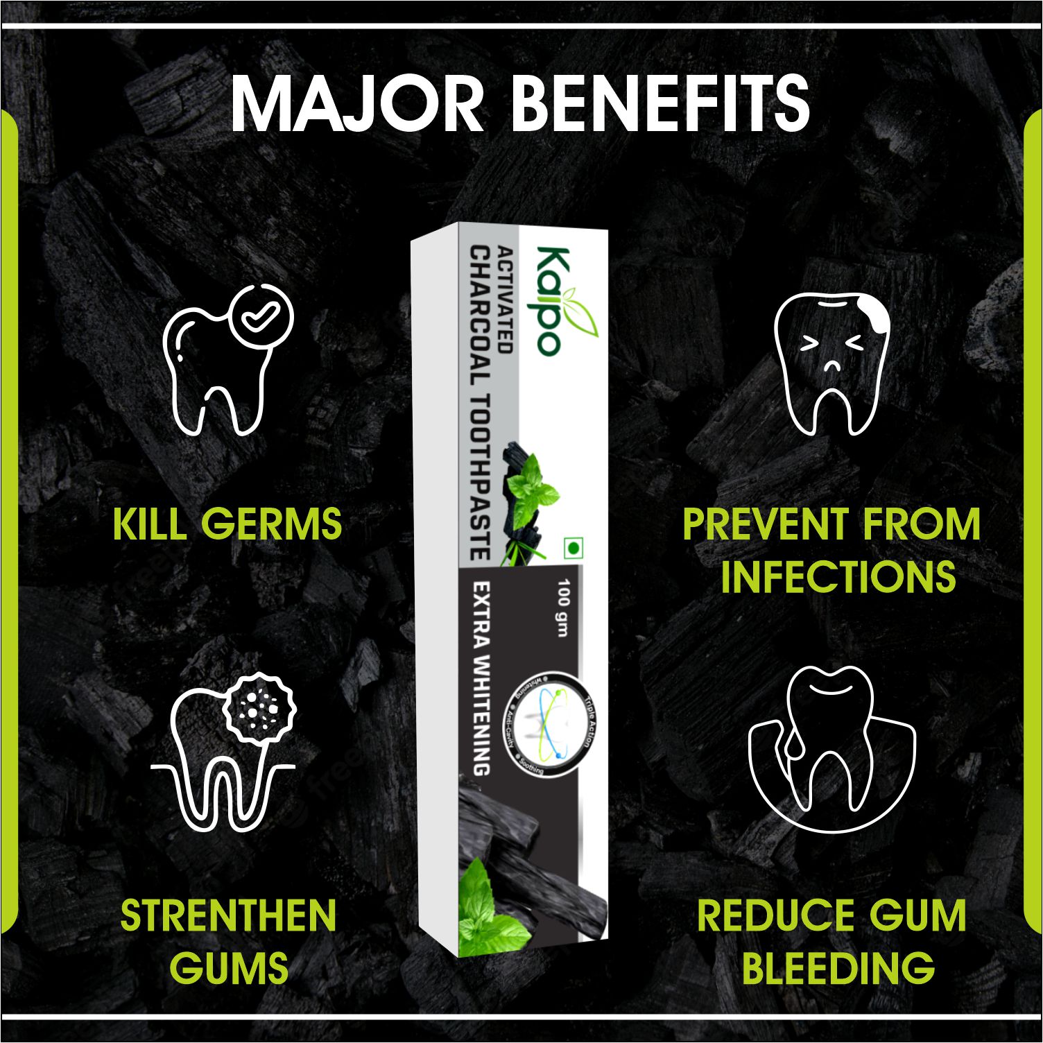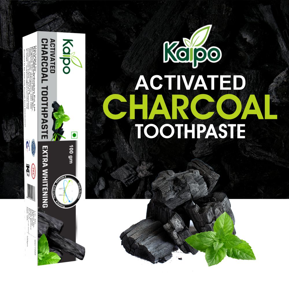 KAIPO ACTIVATED CHARCOAL TOOTHPASTE MRP: ₹90/- 100 gm (Inclusive of all taxes) USP: ₹0.90/- per gm